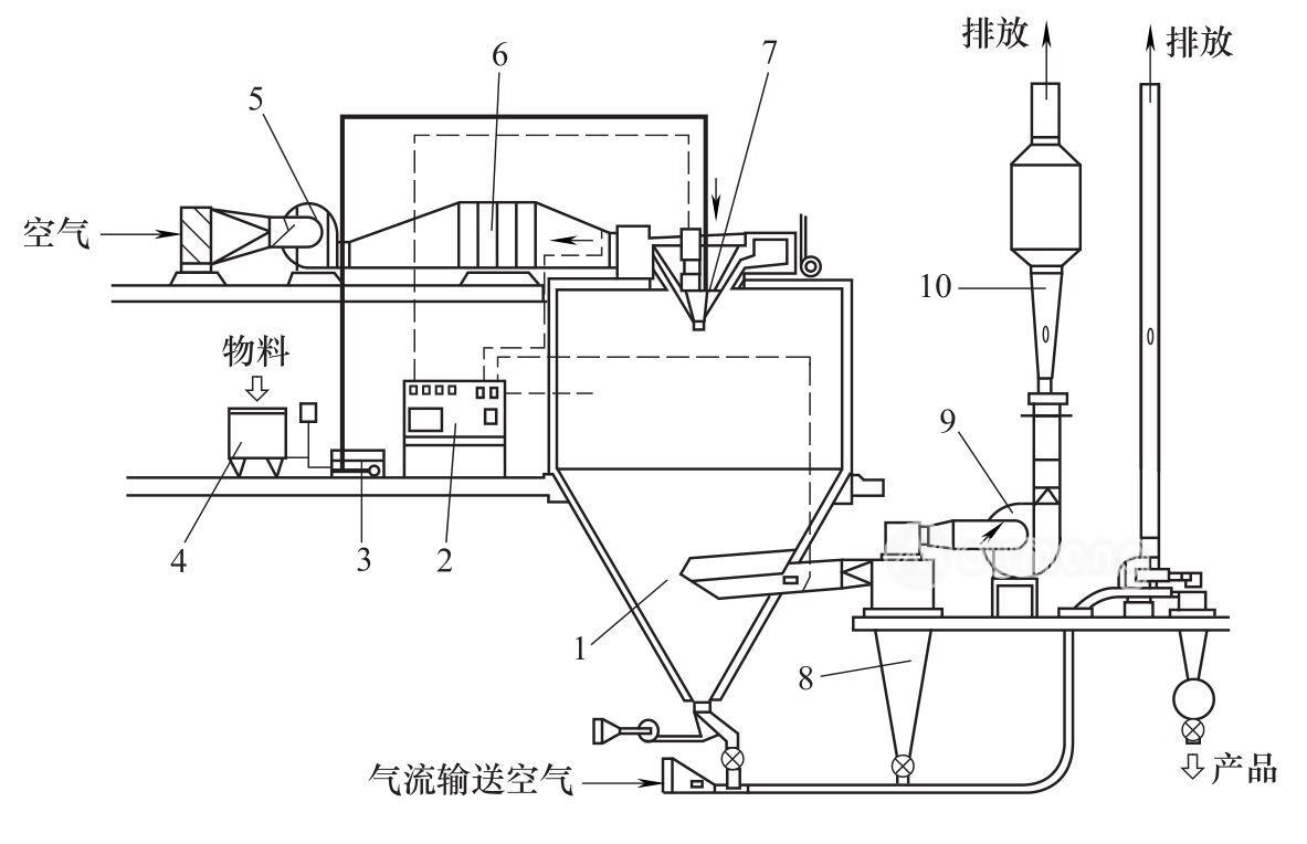 1—噴霧干燥塔;2—控制板;3—料液泵;4—料液貯槽;5—鼓風機;6—空氣加熱器;7—霧化器;8—旋風分離器;9—引風機;10—文丘里洗滌器