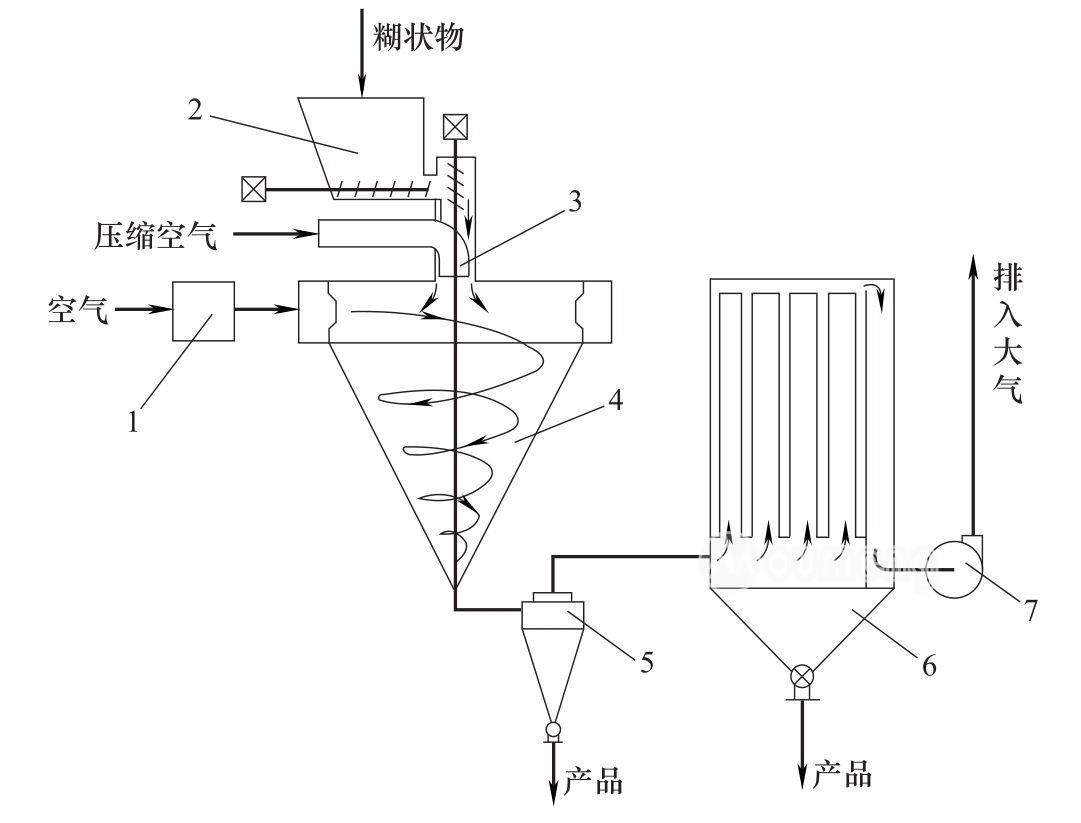 1—空氣加熱器;2—貯罐;3—二流體霧化器;4—噴霧干燥塔;5—旋風分離器;6—布袋過濾器;7—引風機