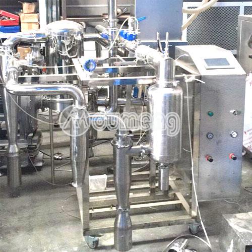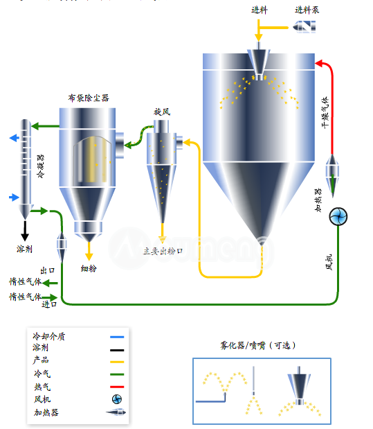 N2氮?dú)庋h(huán)式噴霧干燥機(jī)系統(tǒng)采用密閉設(shè)計(jì),主要應(yīng)用于酒精類溶液,N2作為惰性氣體干燥使得設(shè)備運(yùn)行更加安全。產(chǎn)品無(wú)氧化,品質(zhì)好,粉料松裝比重及平均粒徑一致性好,其流動(dòng)性可滿足自動(dòng)壓機(jī)連續(xù)化生產(chǎn),同時(shí)溶劑介質(zhì)可以在線回收。在規(guī)定的條件下溶劑蒸發(fā)能力2Kg/h(根據(jù)物料固體含量)。整套設(shè)備由供料系統(tǒng)、霧化器、電加熱器、干燥塔、旋風(fēng)收塵器、冷凝塔、防爆裝置、在線氧氣檢測(cè)系統(tǒng)及電氣控制系統(tǒng)組成等。